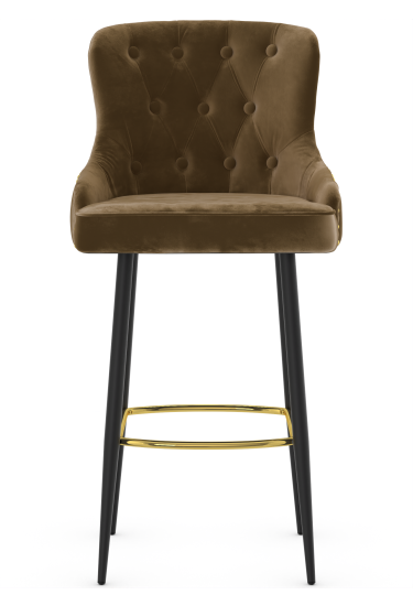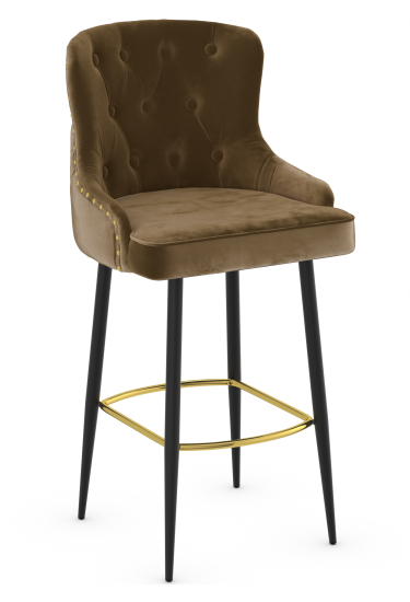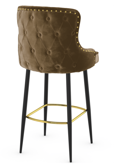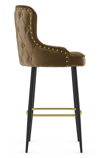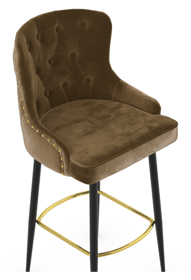 The Arundel High Bar Stool exemplifies timeless elegance, combining plush comfort with striking sophistication. Upholstered in a rich brown velvet fabric, the stool radiates warmth and understated luxury. Its gently curved backrest features classic diamond button-tufting that adds texture and visual interest, while embracing the sitter in soft support. The sides and back are detailed with a neat row of gold-finished decorative studs, adding a refined accent that reflects its Art Deco influence.