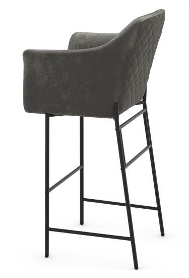 The rear view of the Chelsea stool reveals elegant diamond quilting across the back panel, a refined detail that adds texture and sophistication. This contrast between the smooth front and quilted back elevates its visual appeal from all angles—ideal for open-concept spaces where every side counts. The stool is anchored by slender black metal legs with integrated footrests for added stability and comfort. Altogether, Chelsea strikes a balance between glam and industrial aesthetics, perfect for interiors that crave a mix of plushness and clean lines.